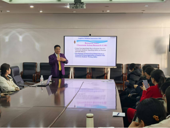 12月23日下午,在公司科研处的精心安排下,泰国武里南皇家大学国际事务副董事长,纳瓦明· 普拉查南特,受邀为bevictor伟德官网教师做题为“21世纪英语教学与研究的趋势”的学术讲座。bevictor伟德官网经理刘静、副经理贾振峰以及部分英语专业教师听取讲座。
