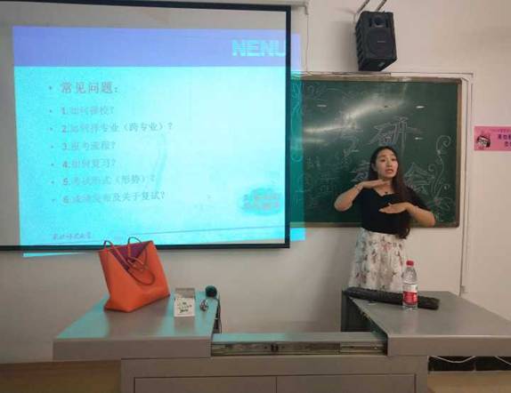 会上,王洪晶就如何择校、如何择专业、报考流程、如何复习、考试形式、成绩发布及关于复试等6个方面为与会的学弟学妹们绘声绘色的进行讲解,并分享了她考取东北师范大学教育学专业研究生的经历。她将自己考研道路上积累的经验毫无保留地分享给了与会的同学,并鼓励同学们可以在暑假期间去考研公司实地考察。同时,她不忘叮嘱学弟学妹们要有自信,积极充分备考。随后,现场提问环节中,同学们积极的提出心中的疑问,她都细致耐心的为大家一一解答。