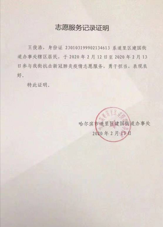 疫情防控期间,王俊皓同学同中共道里区建国街道社区工作人员一起开展防疫工作,封闭小区、给辖区内的街道消毒以及给被封闭在楼里的居民发放生活物资等工作,保障了辖区内居民的安全。