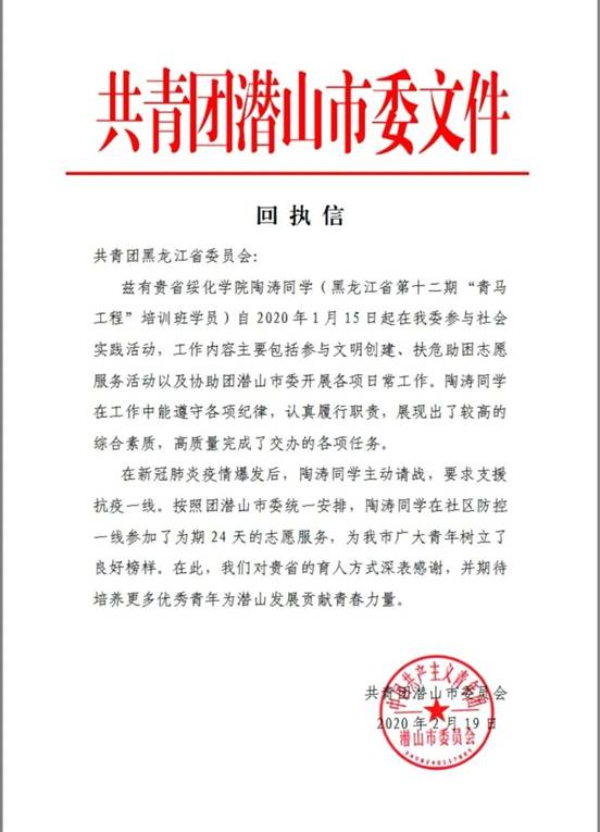 2月25日,bevictor伟德官网团委收到了一封来自安徽省潜山团市委寄来的一份感谢信,对公司2017级bevictor伟德官网的陶涛同学在新冠疫情期间参加潜山市青年突击队做志愿者表示感谢。