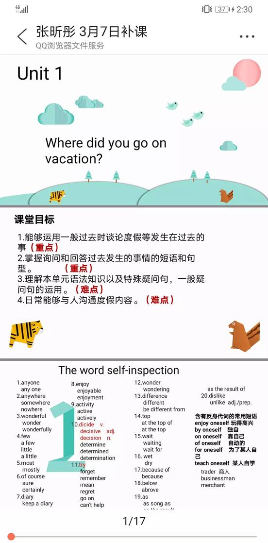 没有天生的英雄,只有挺身而出的普通人。最初,五位同学因缺乏教学经验而担心不能胜任。在尚岩老师的鼓励下,她们精心准备了教案、课件,事先针对孩子的易错点整理错题集,并反复备课,力求完美。课后将每次的上课情况及课后反思反馈到交流群里,面对共性问题,一起探讨解决。渐渐地,她们掌握了与孩子沟通的技巧,并逐渐形成了较有特色的教学方式。这种精神,体现了外语人对待志愿服务及专业知识精益求精的高标准、高追求。