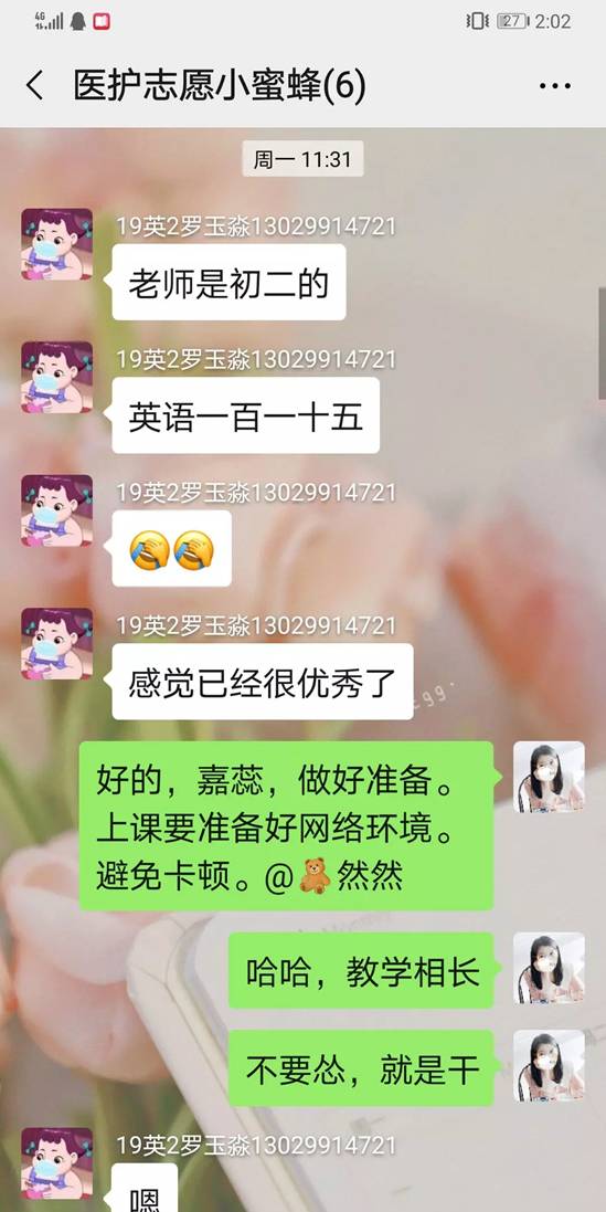 杨卓来自2019级俄语一班,在志愿服务过程中,她一丝不苟,认真对待每一次补习,还设计了英语对话环节,提高员工的学习兴趣。她说:“我很高兴可以参与到这次志愿者服务当中,在疫情之下,医护人员们不畏艰难险阻奋战在一线的精神值得我们去尊敬和学习。身为老员工的我们,也应该奉献出自己的一部分力量去帮助他们的子女,为解决一线工作者的后顾之忧而竭尽全力!”