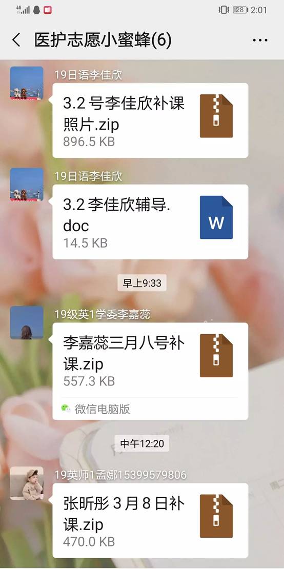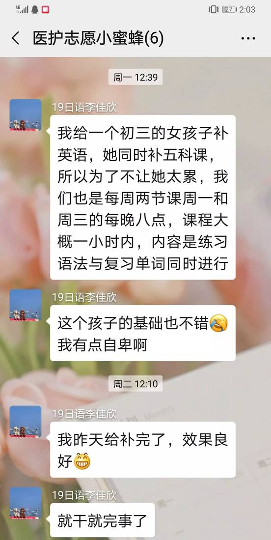 李嘉欣来自2019级日语一班,她精心准备,课前制订辅导计划,课后及时总结反馈,尽最大的努力与员工分享学习知识的快乐。她说:“作为新时代的青年人虽然无法冲到前线,但我们依然有着相应的担当。医护人员的牵挂由我们来守护,谢谢你们变成一束光把黑暗照亮,感谢你们在疫情防控期间的付出,也希望你们在照顾病人的同时照顾好自己。春天不会缺席,我们一定可以度过这个难关。中国加油!”