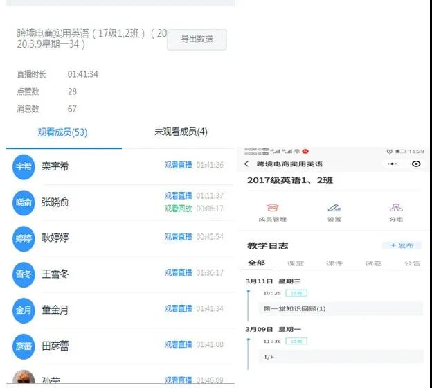 层面1钉钉直播。通过课表的直播时间提前进入课堂做直播准备,对教学内容直播讲解。在直播讲解过程中通过互动版面完成师生之间的互动以及答疑(图2),这样做的优点是实时互动,益于及时了解员工的掌握情况。通过查看数据可以实时监测同学们出席的情况,并可以通过直播数据看到同学们的具体情况(图3),以确保同学的出席