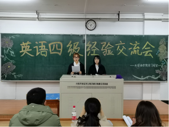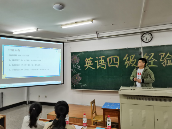活动伊始,张博、杜雪晶、杨航分别向大家分析了四六级考试的结构、占分比例、重难点、得分点、失分点等考试卷面所包含的内容,重点强调了听写、词汇还有阅读以及语法这方面的重要性。紧接着,着重从“如何正确调整心态”和“怎样合理安排时间”两个方面做了鼓舞动员,向大家分享了一些四六级考试中可用到的得分技巧以及注意事项。最后,张莹为本次活动作出了总结,相信同学们经过不懈的努力,一定能在四六级考试中取得不错的成绩。
