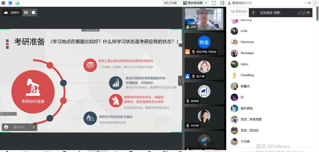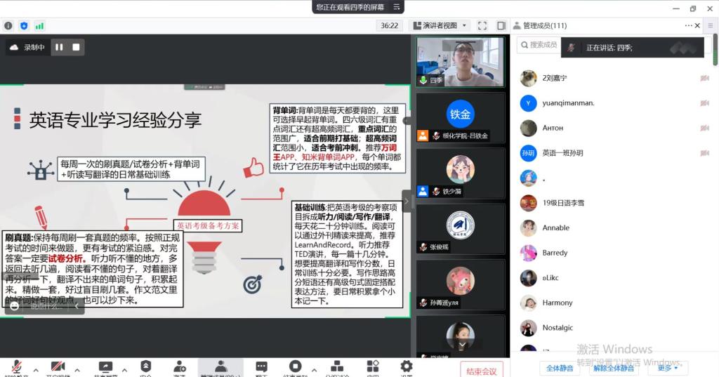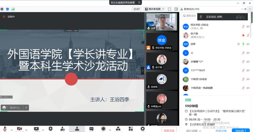 王浴四季以自身外语专业学习和科研经历为案例,深入浅出地从外语专业学习的经验、本科生科研能力的提升、职业生涯规划、考研准备过程和读研经历等维度进行了分享和阐述。他建议本科生通过考取职业资格证书和专业过级考试提高外语专业素质和技能,通过撰写毕业论文、参加学科竞赛和夏令营活动等途径深化外语科研能力,在学术实践活动中形成外语思辨能力、自主学习能力和跨文化沟通能力。个人职业生涯规划应尽力做到学习出色和员工工作出众。