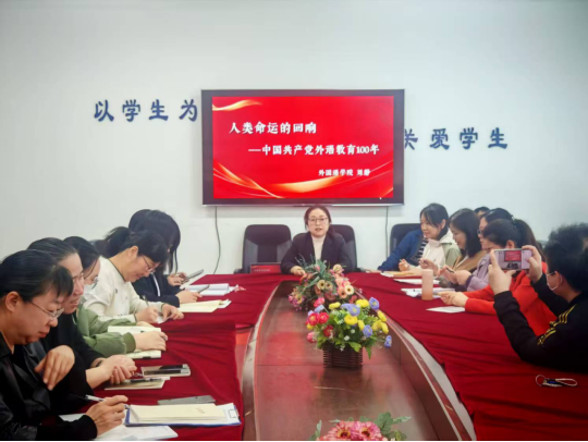 会议伊始,刘静讲述了开展此次活动的目的与意义,并做出了阅读的经验分享。她围绕《人类命运的回响——中国共产党外语教育100年》展开深入分享,此书以中国共产党成立100周年为主线,系统回顾了党领导下外语教育的百年历程,全方位展现了外语教育与党和国家命运的紧密相连。她强调,外语教育始终肩负着“为党育人、为国育才”的使命,在培养具有中国情怀、全球视野的复合型人才,服务国家战略需求方面发挥着关键作用。