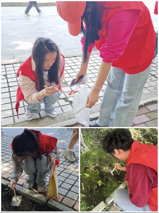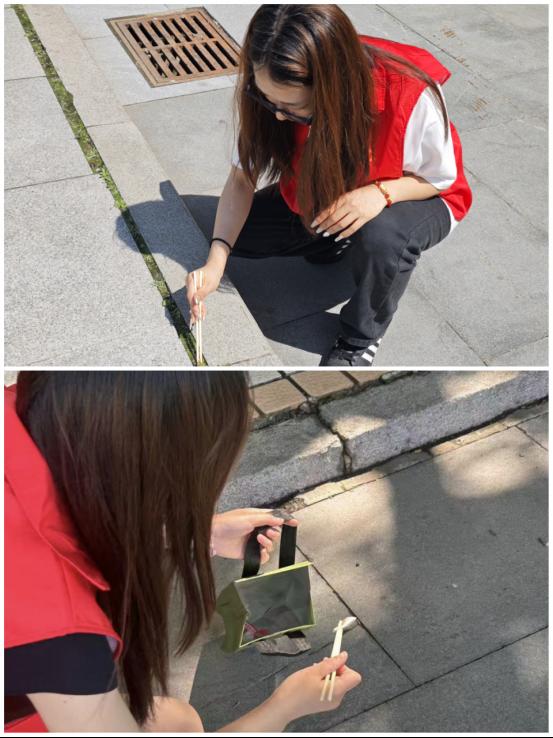 志愿者们集结外语楼前,手持一次性筷子和环保纸袋,沿“弘道楼→第四员工公寓→九思食堂→九思湖→图书馆→篮球场→重阳山→弘道楼”路线开跑。途中目光敏锐扫视路面、草丛,发现垃圾便迅速“跑-停-捡”,将纸屑、塑料瓶等杂物精准收入环保纸袋。