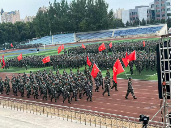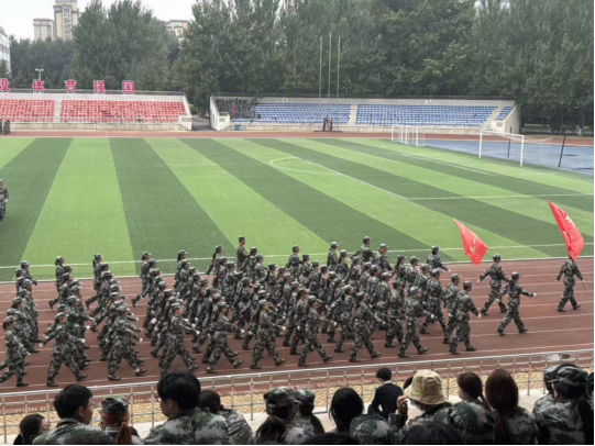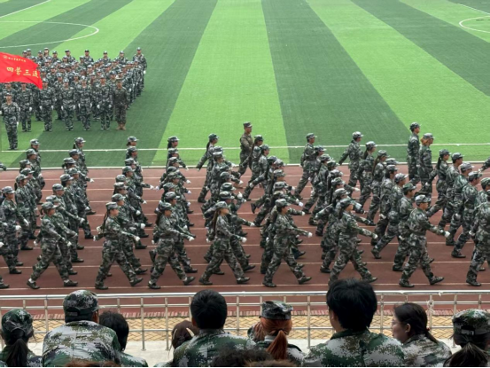 伴随着雄壮的国歌声响起,全体新生肃立注目,凝视着冉冉升起的五星红旗,每个人的神情都格外专注而庄重。在随后的分列式汇报表演中,方阵依次通过主席台,他们步伐坚定有力,动作整齐划一,口号声响彻云霄,充分展现了青春风采。