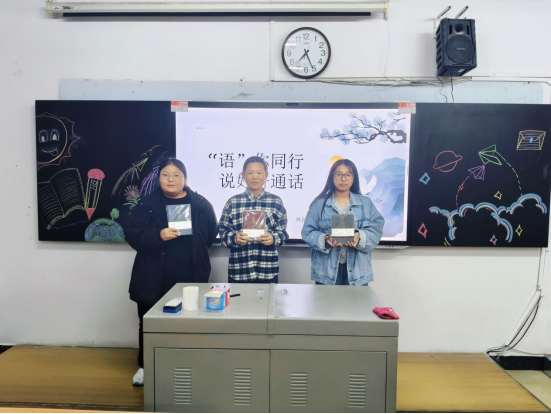绕口令互动环节中,“八百标兵奔北坡”“坡上立着一只鹅”等经典绕口令接连呈现,同学们踊跃举手参与。其中,有人语速飞快且发音标准,展现出扎实功底;也有同学虽中途卡顿,但迅速调整、反复尝试。现场充满着笑声与掌声,气氛热烈。温俊辉根据发音准确度和流畅度评选优胜者,为其颁发笔记本作为奖励,激励大家坚持练习,提升语言表达能力。